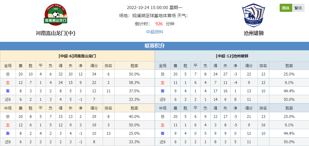 河南嵩山龙门本赛季中超成绩10胜4平6负,积分34,排名第6;沧州雄狮本赛季中超成绩5胜7平8负,积分22,排名第12