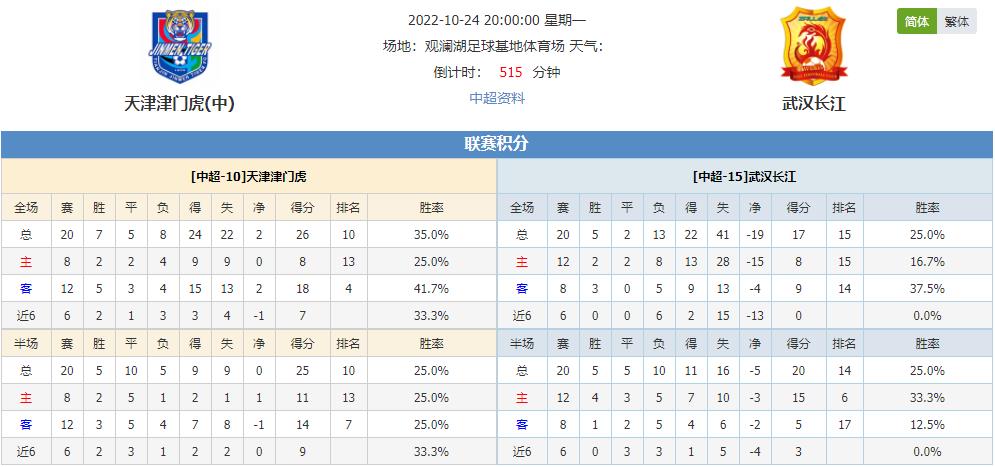 北京时间2022年10月24日20时00分,中超第21轮比赛,天津津门虎对战武汉长江,天津津门虎上轮比赛不敌武汉三镇,连胜势头被终结,此番中立场迎战近期连战连败,状态低迷的武汉长江,天津津门虎能否趁虚而入?