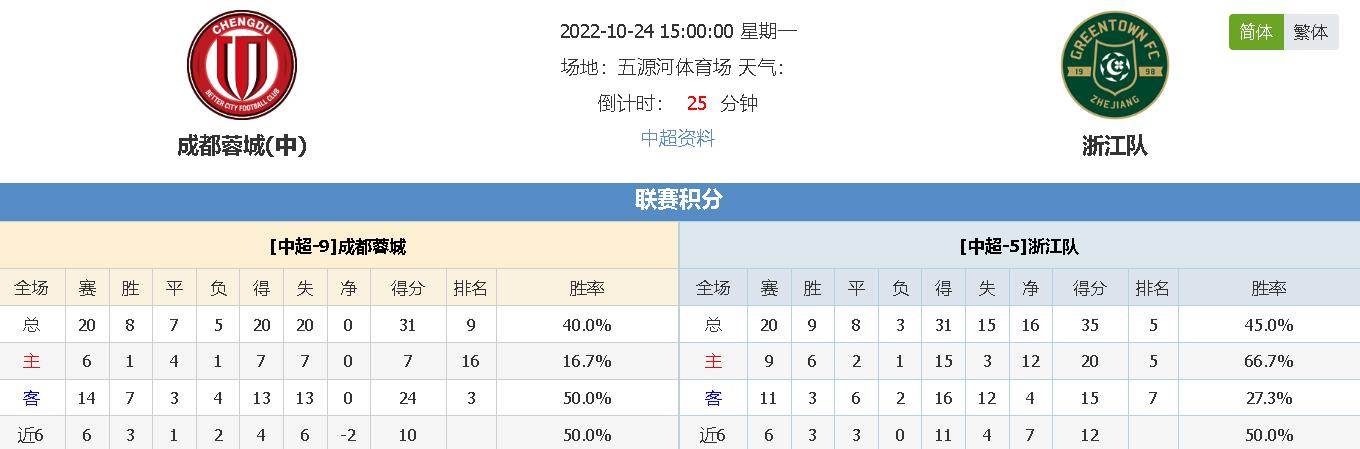 北京时间10月24日15时00分,中超2022赛季第19轮补赛,成都蓉城vs浙江队,两支升班马本季皆表现出色名列联赛中上游,本场比赛有望上演对攻大战,到底赛果如何呢?让我们拭目以待!