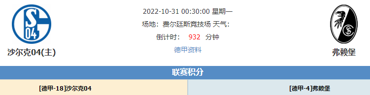 北京时间10月31日00:30, 2022-23赛季德国足球甲级联赛第12轮继续打响,沙尔克04主场迎战弗赖堡。本赛季迄今表现出色的弗赖堡面对近期5连败的联赛副班长沙尔克04,能否客场拿下对手稳固联赛排名?糖果将从多方面为您解读。
