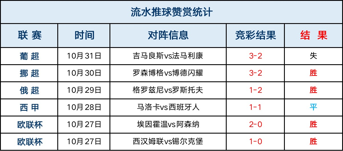 赞赏回顾:流水赞赏昨天葡超失手,目前5胜4。过往赞赏曾有过156天总体胜率近7成(不含走)的辉煌战绩,长期稳定,今天继续一起采摘果实!!!
