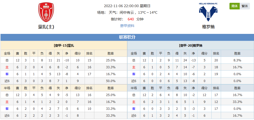 北京时间11月06日22:00,2022-2023 意大利甲组联赛,由蒙扎vs维罗纳,两队近期表现都不尽人意,而维罗纳联赛至今只取一胜,今晚蒙扎面对维罗纳能否取得一场胜利?