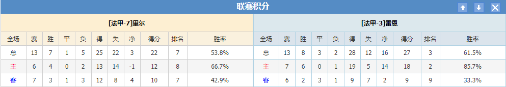 作为法甲中一支不可忽视的队伍,里尔目前在联赛13轮赛事过后以7胜1平5负的战绩排名法甲第7,其中在6个主场作战的比赛中拿下了4胜2负的表现,具有不错的主场“分胜负”能力。而到目前为止,里尔累计打入了25球,该项进攻数据与摩纳哥并列成为法甲中攻击力第三好的球队,但球队同时也有22粒失球,是积分榜排名前10名中丢球数第一多的,可见后防线仍有较大的提升空间。