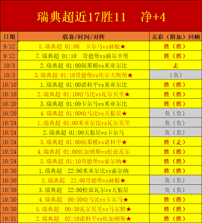3.瑞典超近17胜11,净+4,进入收官阶段后准确率更为高涨,近一周内取得6胜4的上分表现。