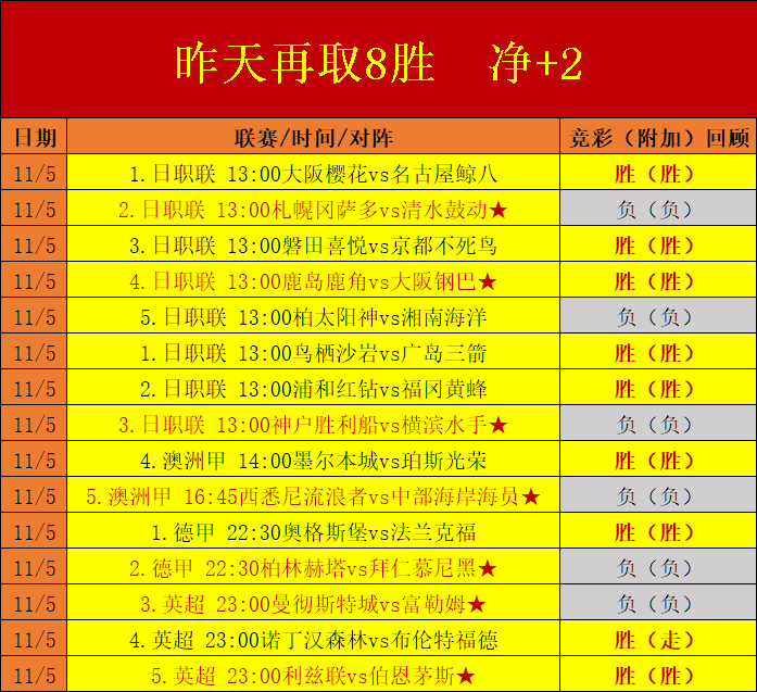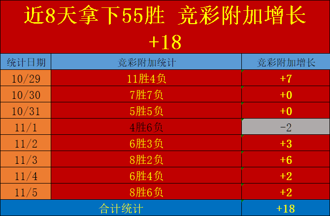 2.近8天时间整体表现持续增优,合计提供了92场有效方向提示,取得了55场的胜利观点,净+18的优势增速,日均正向保持2.3场次表现,上周末两天时间取得净+7的收获,本周前置基础已经打好,周日将迎来完美的收官之战。