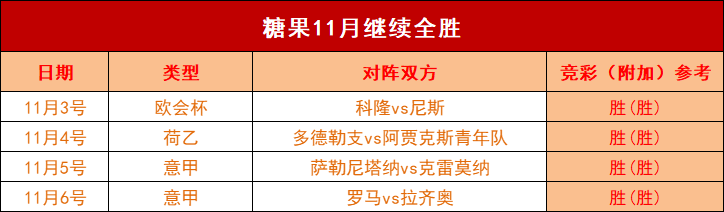 昨天赞赏的意甲客胜拿下高走势!赞赏4连胜!11月迄今保持全胜!世界杯在即,继续保持好的状态,今晚5连胜走起来!状态回归,还请大家包周支持一波,按计划稳定迎利!
