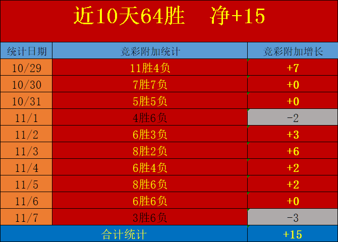 2.近10天表现为64场优质的胜利观点,进度为净+15,日均带来+1.5的上升净值,整段赛程朝着更优质的进度出发!