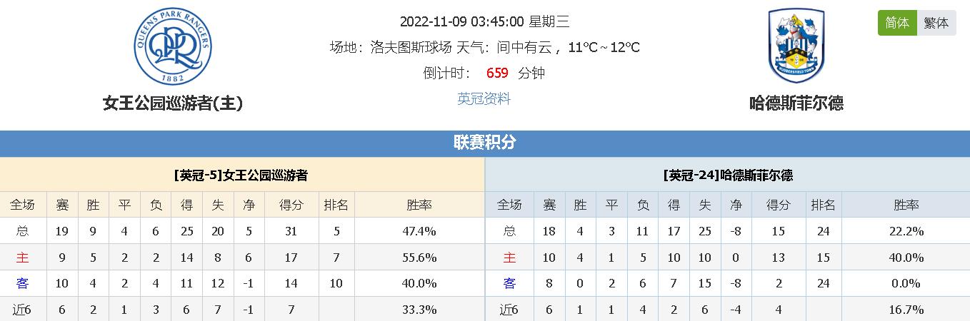 首先从两队近期比赛成绩上看,女王公园巡游者近年来的赛季目标就是冲超,在赛季的表现也是可以排到稳定的中上游位置,面对赛季走弱的哈德斯菲尔德,此番回到主场自然是希望能够趁势在对手积弱之际顺利取走三分重回直升位置的第一梯队,而且球队的锋线已经持续三战哑火,厚积薄发之下在本场比赛或会迎来一场强势的反弹,而哈镇方面当然也是希望到球队的赛季首胜,但是溃散的防线能力难以经得起推敲,因此,我认为本场比赛女王公园巡游者获胜机会较大,但哈镇方面的反扑力度也不能小视,在微弱的数据差距下主队方向可以值得信任,建议方向为让胜、让平。
