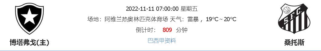 北京时间2022年11月11日07:00,巴西甲2022赛季第37轮比赛,博塔弗戈主场迎战桑托斯,博塔弗戈在本季首回合交战不敌客队,本场回到主场能否复仇成功呢?让我们一起拭目以待!
