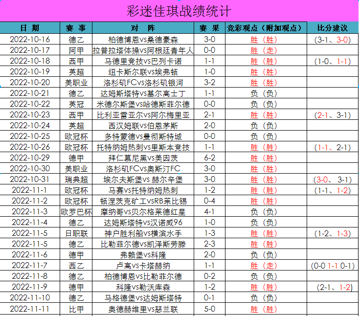 本人彩迷佳琪,自2002年高中时代就精研足球方向,大学期间曾和民间高手探讨一起多次获得胜负彩二等奖。近20年对于足球赛事精细的钻研,得出自己独特的见解,希望与大家共同交流、进步。