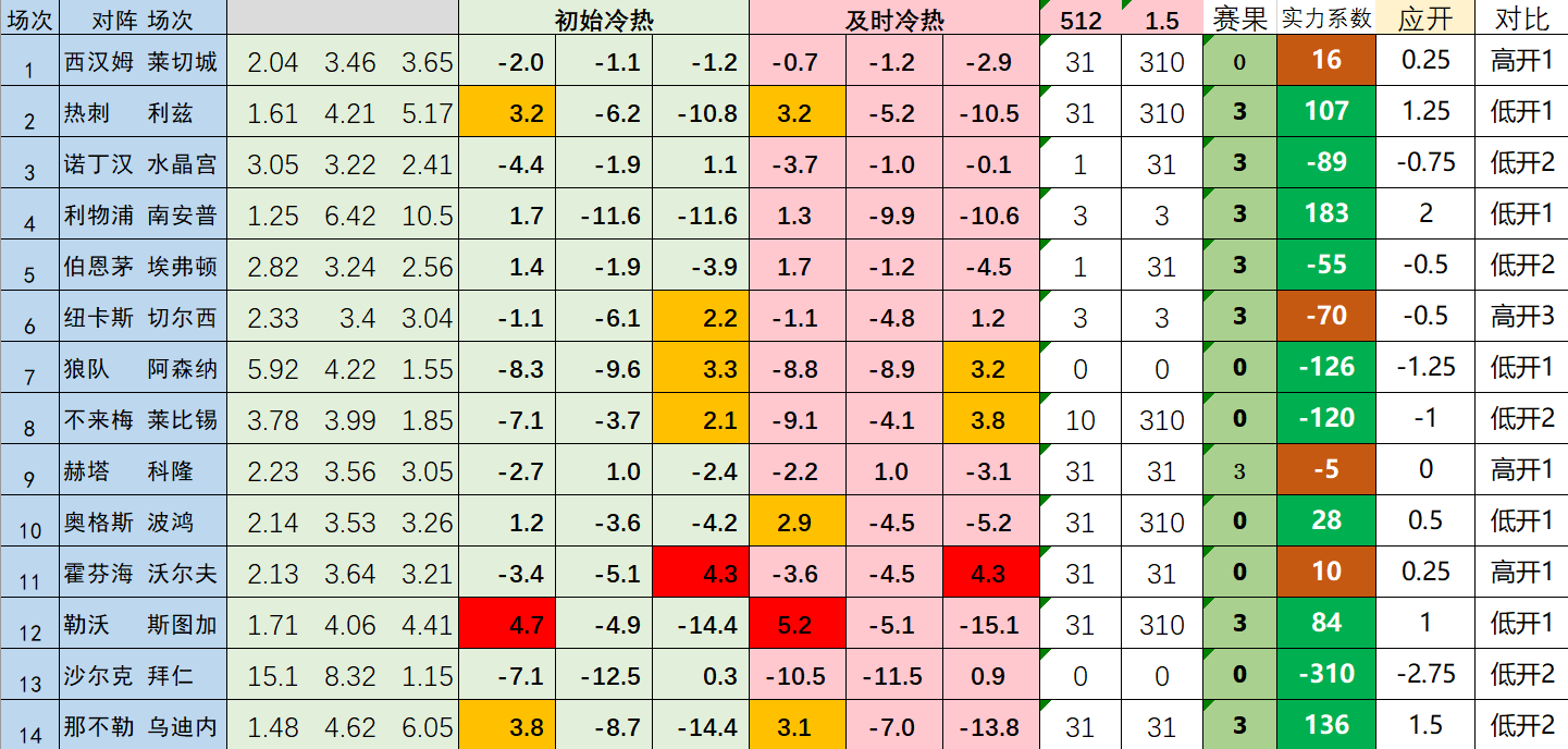 本期十四场由 英超、德甲、意甲和法甲四大赛事组成,整体难度较高,文章将提供十四场冷热和实力系数供大家参考。