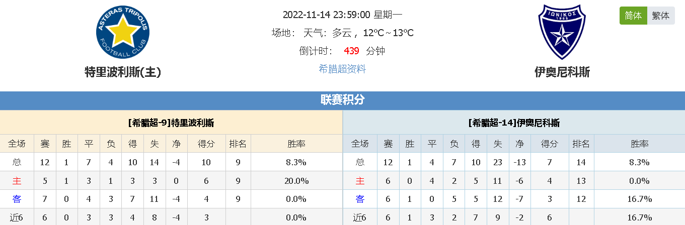 北京时间11月14日23时59分,希腊超2022-2023赛季第十三轮,特里波利斯vs伊奥尼科斯,希腊超中两支表现十分糟糕的球队至今均只收获一场胜利,本场他们能取得赛季第二胜吗?我们拭目以待!