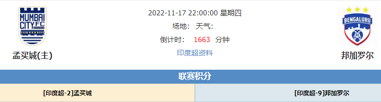 1、2022-23赛季印度足球超级联赛第7轮率先打响,孟买城主场迎战邦加罗尔。印度超联赛共11支球队,以主客场双循环作赛,联赛不设升降级,联赛前4名参加附加赛。孟买城是印度超上游份子,球队本赛季迄今表现也依旧稳定,上轮联赛客场6-2大胜清奈,新赛季迄今保持不败,目前3胜3平积12分排名印度超第2位,球队防守一般但进攻端十分出色,场均得2.67球联赛遥遥领先。