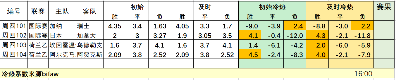 昨日赛事较少,也没有大热场次,不过取胜较热的瑞士、日本、和阿尔克马尔全部打出冷门赛果,冷热系数提示准确,只有埃因霍温略热依旧胜出,不过本场比赛从实力系数来看,主队并无优势的情况下高开,也存在打出空间。
