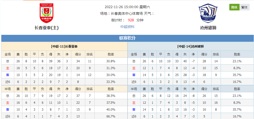 北京时间2022年11月26日15:00,此役是长春亚泰与沧州雄狮历史的第八场对决,长春亚泰表现惨淡,他们只能在弱旅身上找回自信,此役能否保持胜势全取三分。而沧州雄狮势头持续回暖,球队近五仗下来仅遭一败,此役他们能否延续状态保住不失?