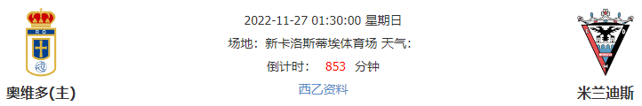 北京时间11月27日01点30分,22-23西乙联赛第17轮的一场比赛,米兰迪斯将前往新卡洛斯蒂埃体育场与奥维多展开较量。奥维多近期状态明显回暖,本轮保级争夺战,球队有望在主场全取三分。