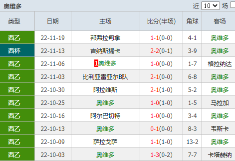 2、随着联赛的深入,奥维多的表现有所改观,在上轮主场1-0小胜格拉纳达后,球队取得主场两连胜。