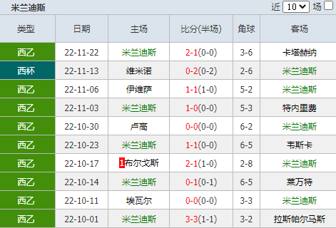 2、两队过往有过多次交锋记录,在近期10次的交手当中,米兰迪斯的战绩是1胜3平6负,并不占优势。