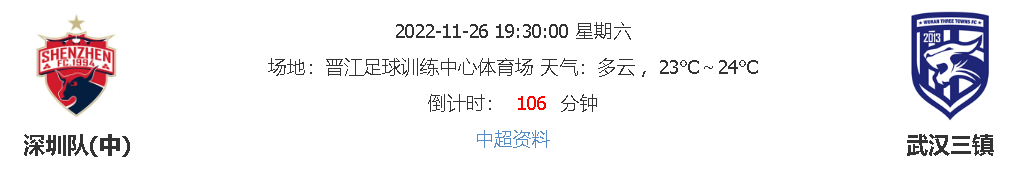 北京时间11月26日19:30,中超联赛2022赛季第27轮比赛,深圳队vs武汉三镇,深圳队在经历换帅之后的抢分蜜月期已过,球队近期对于胜利也是可有可无的态度,本场对手武汉三镇领跑了积分榜大半个赛季,近期再次反超山东泰山回到榜首,此战深圳队是毫无战意还是选择打出一次轰烈的阵前磨刀?让我们一起关注!