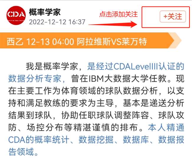 我是概率学家,是经过CDALevelⅢ认证的数据分析专家,曾在IBM大数据大学任教。现在主要工作为体育领域的球队数据分析,以支持和满足教练的要求为主导,基本是递送分析结果到球队,协助任职球队调整阵容、球队攻防、场控分布等精湛谨慎的排布。本人精通CDA的概率统计、数据挖掘、数据库、数据报告领域。