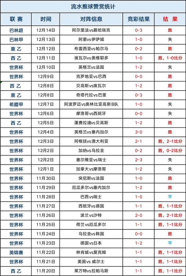 赞赏回顾:流水赞赏再下一城,世界杯期间赞赏25胜19,昨天阿尔里法0-3慕哈瑞克,赞赏方向顺利跑出。过往赞赏曾有过156天总体胜率近7成(不含走)的辉煌战绩,长期稳定,今天继续一起采摘果实!!!