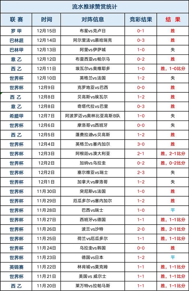 赞赏回顾:流水赞赏连战连捷,世界杯期间赞赏26胜20,昨天布星0-1克卢日,赞赏方向顺利跑出。过往赞赏曾有过156天总体胜率近7成(不含走)的辉煌战绩,长期稳定,今天继续一起采摘果实!!!