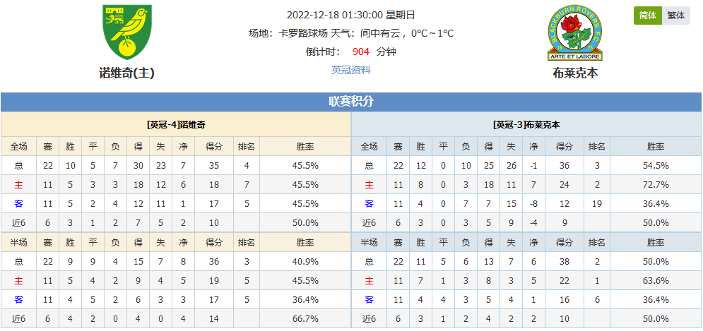 北京时间12月18日01:30,2022-2023 英格兰冠军联赛,由诺维奇vs布莱克本,两队联赛排名仅仅相差1分,而两队近期表现也是较为接近,今晚比赛两队相遇哪一队会更胜一筹?