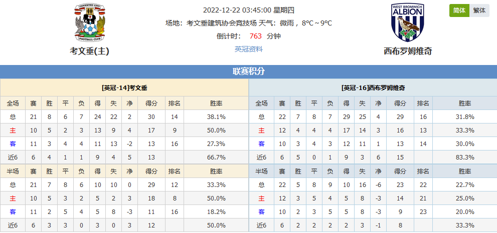 北京时间12月22日03:45,2022-2023 英格兰冠军联赛,由考文垂vs西布罗姆维奇,考文垂近2场比赛表现有所下滑,而他们过去面对西布罗姆维奇仅仅取得一场胜利,今晚比赛坐镇主场会有怎样表现?