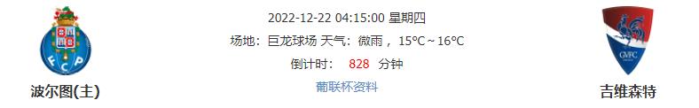 北京时间12月22日04时15分,葡联杯的一场焦点比赛,波尔图vs吉维森特,波尔图上轮杯赛主场4-0大胜维泽拉,目前状态正佳,此役主场面对在往绩方面处于绝.对下风的吉维森特,波尔图能否再次大胜?