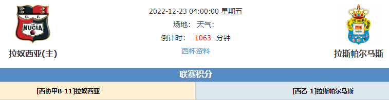 1、2022-23赛季西班牙国王杯第二圈继续打响,拉奴西亚主场迎战拉斯帕尔马斯。西班牙国王杯共8轮,除半决赛采取主客场两回合制外,其他轮次均为一场定胜负制。拉奴西亚来自西协甲联赛,球队近期状态不错,上轮联赛客场3-2战胜皇家社会B队,近4轮联赛3胜1平保持不败,目前5胜8平4负积23分排名西协甲第11位;西杯方面,球队在第一圈通过加时赛客场4-2战胜赫库斯,从而挺进第二圈。