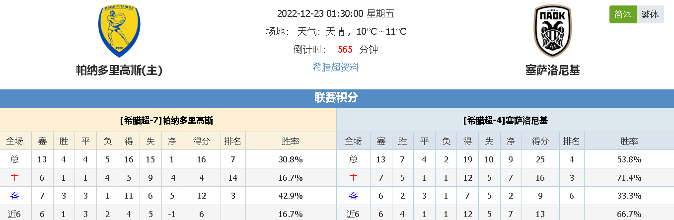 北京时间12月23日01:30,希腊超2022-2023赛季第14轮比赛,帕纳多里高斯vs塞萨洛尼基,双方虽然在排名上只差3名,但上半赛季的表现却反差很大,主队往绩面对塞萨洛尼基都是俯首称臣的姿态,本次回到主场能否扭转乾坤改写多年来积下的耻辱成绩?让我们一起关注!