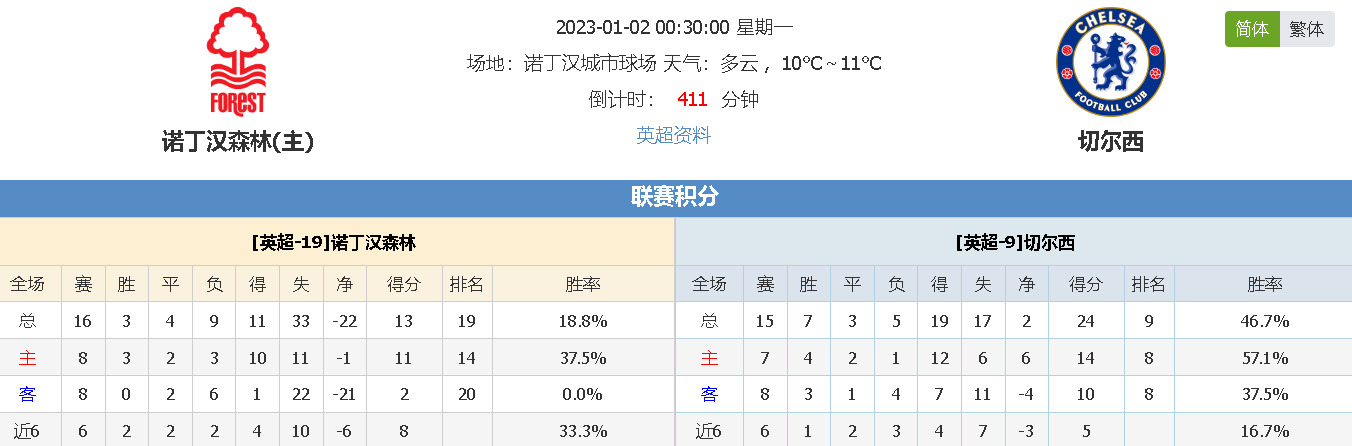 北京时间01月02日00时30分,英超联赛2022-2023赛季第18轮比赛,诺丁汉森林vs切尔西,作为升班马的主队目前尚未适应英超的节奏还需时间调整,客队切尔西近端状态糟糕制胜能力下滑严重,但上场比赛他们重归胜利轨道复苏有望,本场比赛到底鹿死谁手呢?让我们一起关注!