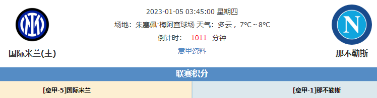 1、2022-23赛季意大利足球甲级联赛第16轮打响,国际米兰主场迎战那不勒斯。意甲联赛共20支球队,以主客场双循环作赛,联赛前4名参加下赛季欧冠小组赛,5-6名参加欧罗巴小组赛,第7名参加欧会杯小组赛,后3名直接降级。国际米兰是意甲豪门,上上赛季的意甲冠军,球队本赛季迄今表现也较为稳定,上场友谊赛客场1-0战胜森索罗,近7场各项赛事6胜1平保持不败,目前10胜5负积30分排名意甲第5位,球队进攻出色但防守糟糕,场均得2.27球联赛第2多,但场均失球也高达1.47个。