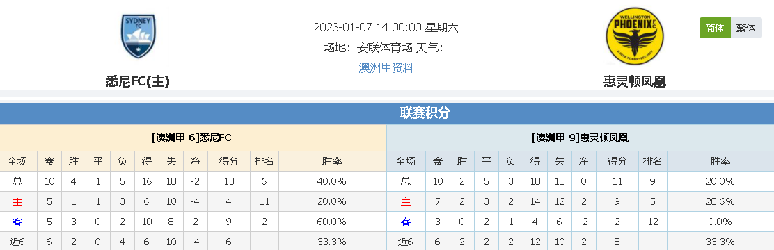 北京时间01月07日14时00分,澳洲甲联赛2022-2023赛季第11轮比赛,悉尼FCvs惠灵顿凤凰,主队在上轮终结连败迎来了胜利,本场势必希望谋求再进一步收获连胜,而惠灵顿凤凰在主场不敌榜首球队手上丢失3分但场上也能表现出十足的拼劲,本场将重新上路求取胜利,今天的胜利女神会青睐哪一方呢?我们拭目以待!