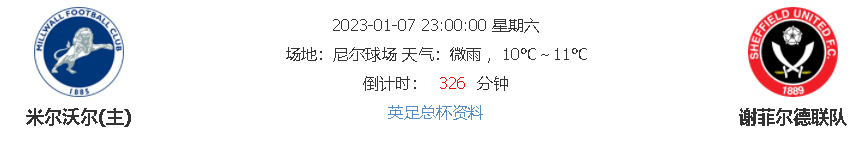 北京时间2023年1月7日23:00,英足总杯2022-2023赛季第三圈比赛,米尔沃尔vs谢菲尔德联队,双方目前在英冠联赛同属升级阵营但实际存在积分差距,本次来到英足总杯的赛场双方将会交出何种战意?让我们一起拭目以待!