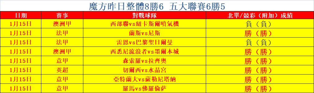 魔方昨日狀態十足,整體打出8勝6,其中五大聯賽6勝5。魔方將繼續努力,追求精益求精。今日對歐賽進行精研。