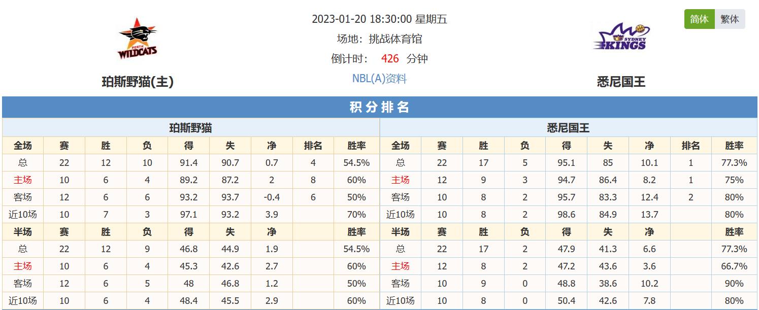 北京时间1月20日18:30,NBL(A)珀斯野猫主场对阵悉尼国王,珀斯野猫拿下连胜仍然出色,目前保持在联赛前列,而悉尼国王势如破竹,他们能否将胜势带到客场,此役究竟去能取得胜利?让我们拭目以待!