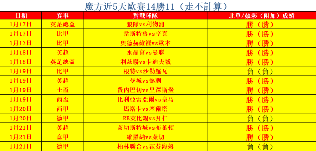 魔方昨日已完成賽事6勝4,近5天歐賽打出14勝11的好成績!今日繼續對歐賽進行精研。