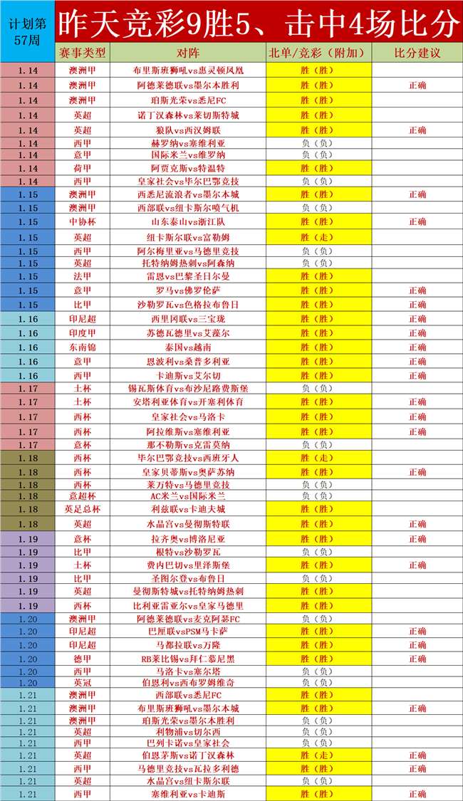 1、推演士计划第57周(走不纳入统计)昨天状态继续炸裂,昨天竞彩9胜5,昨天继续击中比分,有4场比分正确,5天拿下31胜21的佳绩,5天共预测16场比分正确,稳定的状态已经持续了数月,从未让大家失望过,如此稳定的状态有赖于背后的精研团队和推演模拟技术,今天周末,必定完美收官。