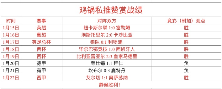周日私推赞赏1场+总进球数1场,完美全胜拿下,很舒服!私推赞赏近8胜6,状态稳定!总进球数稳稳拿到连胜!新的一周,继续全胜搞起来!祝老铁们新年快乐,恭喜发财,身体健康,球运亨通!
