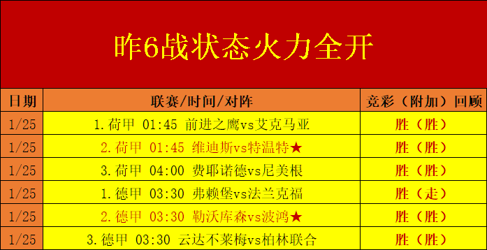1.继上周7天以全胜表现走出之后,本周除了首日的受阻表现外已经拿到了2天的优秀成绩,昨天两个板块比赛更是直接状态全开拿下了6战全胜的优秀成绩,德甲和荷甲的优势成绩再次得到了扩展;