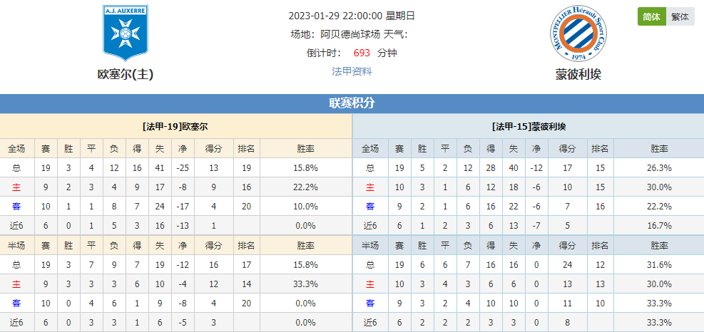 看点:欧塞尔遭遇4连败,此役回归主场作战对阵状态不佳的蒙彼利埃状态能否好转?蒙彼利埃遭遇3连败,后防漏洞百出,此役对阵降级区的欧塞尔状态能否有所好转?