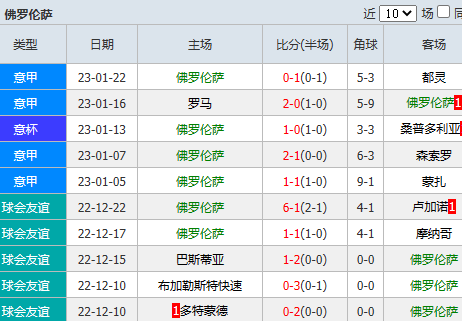 2、和主队相比,佛罗伦萨在实力上并不占优,近10次与拉齐奥交锋,佛罗伦萨只是取得1胜1平8负的成绩。