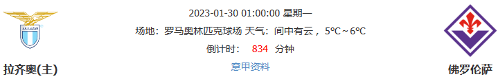 北京时间01月30日01点00分,22-23意甲联赛第20轮的一场比赛,佛罗伦萨将前往罗马奥林匹克球场与拉齐奥展开较量。佛罗伦萨当前在联赛中遭遇两连败,本轮遭遇近期势头正劲的拉齐奥,佛罗伦萨客场失利在所难免。