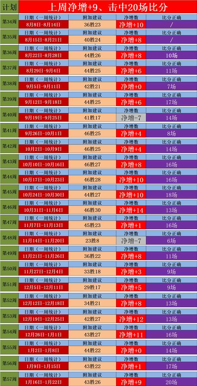2、上周继续保持增长,连续9周净增长,上周预测20场比分正确,击中比分突破历史新高度,持续的保持了高效的稳定。