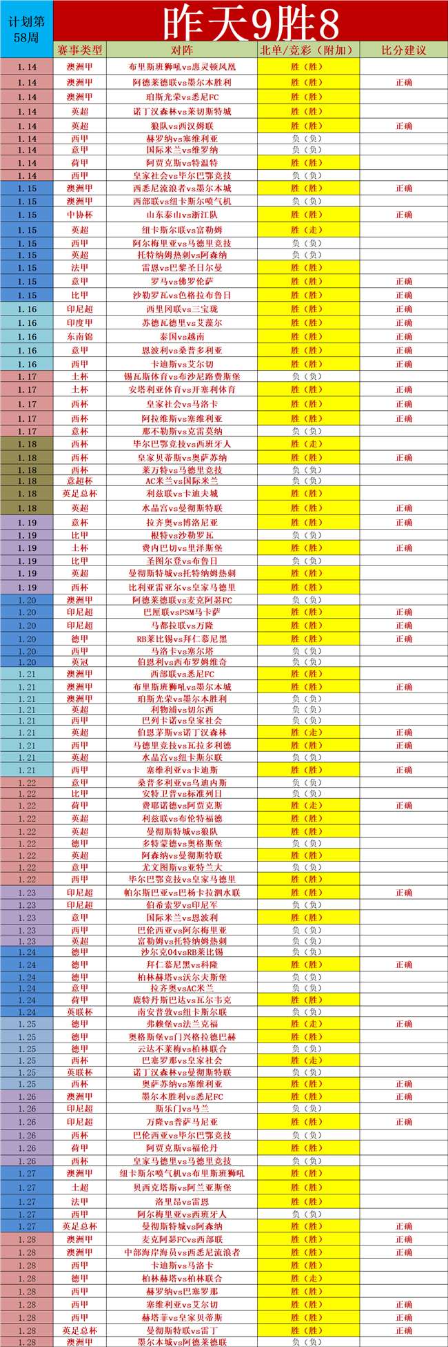 1、推演士计划第58周(走不纳入统计)昨天已经接近登峰造极的境界了,拿下了竞彩9胜8的佳绩,并且击中5场比分,有4场都是大比分,创造了多项连胜的记录,五大联赛2天拿下了7胜6的佳绩,状态持续火热中,今天周日乘胜追击,本周必定完美收官。