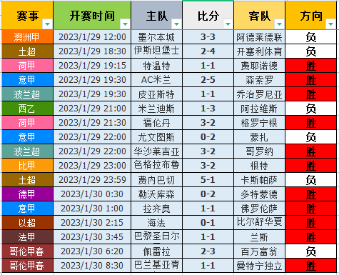 昨天数据表现出色,整体17胜11!昨天数据中,早场的表现不错,5场有3场顺利打出!其中荷甲、意甲和波兰超都完美的打出对应的高概率方向,非常的给力!而澳洲甲和土超都未能打出,比较可惜!晚场的表现稳定,其中荷甲和波兰超继续完美的打出对应的高概率方向,非常的精彩!而土超则是继续未能打出,比较无奈!当然非常精彩的是比甲,在上半场颗粒无收的情况下,在下半场短短十分钟轰进了5个球,非常的给力,进球数也完美的拿下!夜场的表现出色,6场有5场顺利打出,其中德甲、意甲和法甲都完美的打出对应的高概率方向,非常的精彩!当然以超的表现也非常的不错,客队开局1分钟就进球奠定了胜利,非常的牛!而哥伦甲则是一胜一负表现平稳!