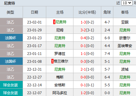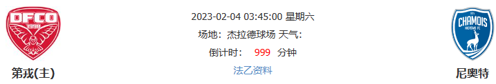 北京时间02月04日03点45分,22-23法乙联赛第22轮的一场比赛,尼奥特将前往杰拉德球场与第戎展开较量。尼奥特近期状态不佳,本轮作客第戎,其客场发挥不宜高估。