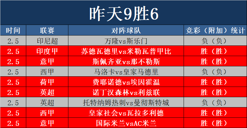 精彩分享:昨天周末冲刺打出了漂亮的成绩,昨天9胜6,昨天的3张贴,都是3胜2的成绩,焦点战的比赛都取胜了,荷甲的强强对决,英超的保级战,还有意甲的米兰德比,全部拿下,这些焦点战笔者都是经过深沉的研究,今天周一,我们乘胜追击。