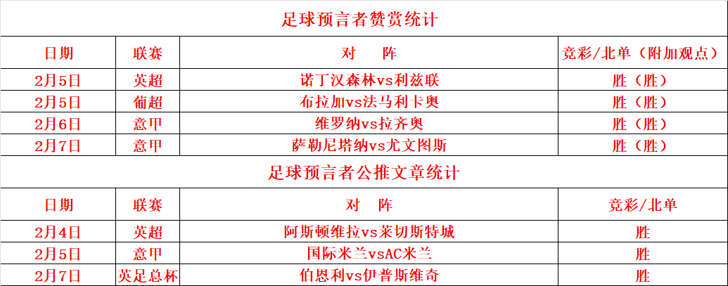 3、有小伙伴们建议笔者在送出比赛方向的同时,能否预测比赛结果,预测比赛结果是有相当的难度,往后的时间里如果是有信心的,笔者会附加上比赛结果,在这感谢大家一直以来的支持。